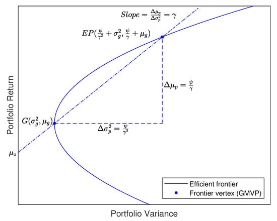 Likewise, by substituting different values of into , we can trace out a positively-sloped frontier (denoted as ) in the mean-variance space. In this situation, a conservative MVU investor with a higher risk aversion coefficient will build a portfolio that is close to the GMVP; conversely, the portfolio choice moves away from the GMVP as declines.