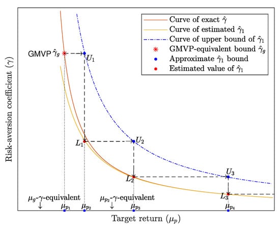 When applying the MVU in practice, investors construct portfolios based on their subjective risk aversion coefficient coverage. Such an approach is appropriate if we can ignore the parameter estimates; however, the portfolios make the investment decision unclear due to the estimation risk. For example, Bodnar and Okhrin [] indicated that the GMVP equivalent has a wider confidence interval. This section approximates the bounds for non-GMVP-equivalent portfolios based on Equation (7).