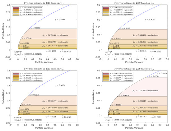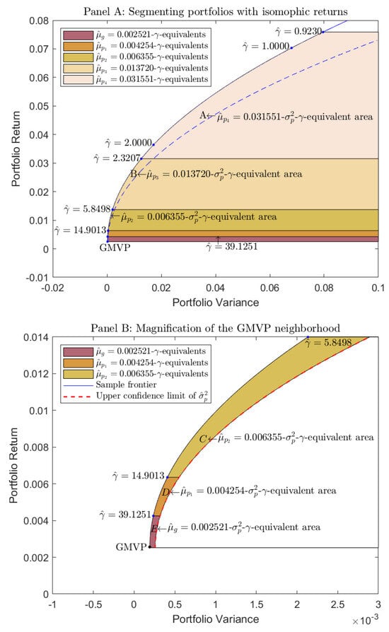 Many portfolios may be --equivalent at the level. The classification of mean-variance portfolios starts with the --equivalent, where the portfolio returns range from 0.002521 to 0.004254 (with ); this tier is narrower than the others. The second tier is the --equivalents, where the portfolio returns and risk aversion coefficients are and , respectively. The following tier proceeds in a similar manner, ending at the --equivalents (with ). In contrast, we observe that most of the values of cluster around the --equivalent, fall inside the --equivalent, the - equivalent contains , and the --equivalent only contains the lower risk aversion coefficients . Next, we use Equation (35) to approximate the confidence limit of according to the vertical return axis. The area bounded by the sample frontier and upper confidence limit is the ---equivalent portfolio.