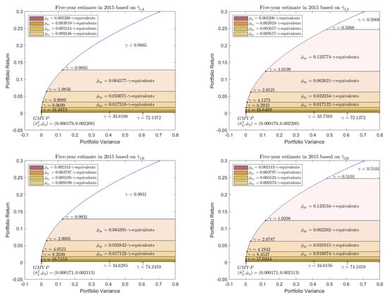 Through either a closed-form solution or a numerical method, Figure 2 denotes , which is the desired target return when solving Equation (31). Substituting into Equation (30), we obtain the corresponding first-degree approximation and the --equivalent interval . All the portfolios with are statistically equivalent to the efficient portfolio with the risk aversion coefficient (or the target portfolio ). As a result, we obtain three isomorphic hierarchies of --equivalents, including , ; in addition, the remaining target returns are higher than . We obtain the second --equivalent interval by using as the next starting point and repeating the same procedure. If we successively repeat this process k times, we can segment the frontier into isomorphic hierarchies of --equivalents.