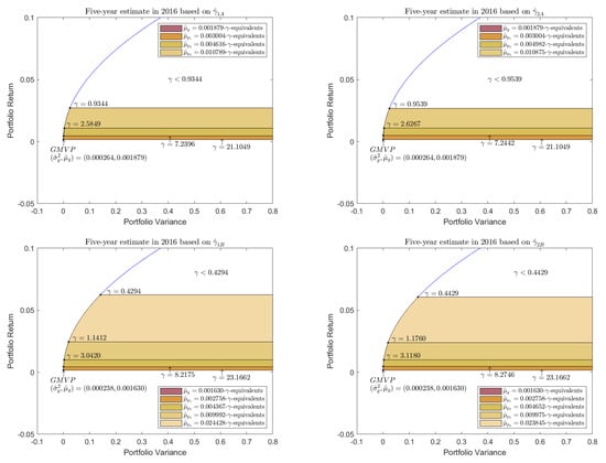 Investors want clarity in their decisions associated with the risk–return tradeoff, which calls for precise risk tolerance given a target return. Variants of Markowitz [] mean-variance analysis (MVA), such as the mean-variance utility (MVU), have been used to determine the relationship between an investor’s risk tolerance and the risk–return tradeoff (see Stevens [], Kan and Zhou []). In the MVU framework, the risk aversion coefficient measures the marginal reward an investor requires to take on more risk (in terms of variance) compared with the global minimum variance portfolio (GMVP, with an infinite ). This measure provides insight into whether a portfolio assumes sufficient risk to achieve an expected return, where a lower indicates a higher target return and more significant portfolio risk. Although the investor’s risk aversion coefficient appears stable on the time horizon, it may be substantially violated after a remarkable financial crisis. For instance, Jackwerth [] indicated that the implied risk aversion functions using the option price and realized returns as indices changed shape dramatically around the 1987 crash. Guisoa et al. [] have also indicated that the risk aversion of investors increased following the 2008 crisis.