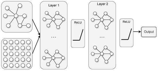 where and represent the non-linear activation function and the trainable weights, respectively. is the degree matrix of (). Additionally, denotes the features at the lth layer, and for the input layer, is equal to X.