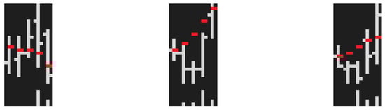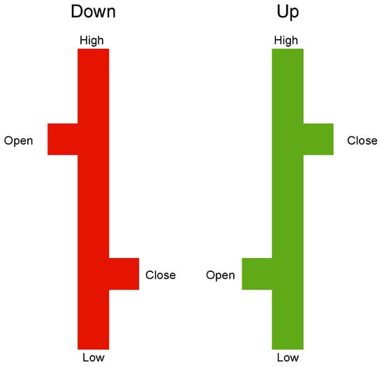 This section discusses how historical market data are represented as input images for the CNN. We create our own charts from the ground up, as detailed in Jiang et al. [], primarily employing OHLC bar charts. As depicted in Figure 4, the high and low prices on the chart are represented by the top and bottom of the central vertical line, whereas the open and close prices are shown by small horizontal lines extending to the left and right of the vertical line.
