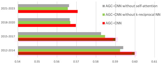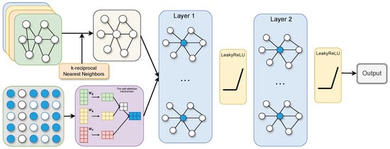The application of GCN requires the provision of both a feature matrix and adjacency matrix. Given the heightened complexity, disorderliness, and non-linearity in stock market data, directly extracting features from raw stock data to generate feature matrices presents inherent limitations. To address this challenge, the self-attention mechanism proposed by Vaswani et al. [] offers a solution by capturing deep-seated features within the stock data, and it has gradually extended to the financial sector [,]. Li et al. [] employed the attention mechanism to tackle the challenges of temporal dependency in financial data, proposing an innovative Transformer encoder attention (TEA) model. Similarly, Wang et al. [] presented a novel policy gradient trading algorithm named DeepTrader, featuring a Market Scoring Unit and an Asset Scoring Unit. The Asset Scoring Unit utilizes the dilated CNN and attention mechanisms to extract temporal and spatial features across assets, while also integrating a GCN to model interrelationships and causal relationships among them. Additionally, GCN utilizes a complete adjacency matrix to depict relationships among different stocks in the stock market. However, this approach may face challenges such as a high computational complexity and large storage requirements, especially when handling extensive stock data. To mitigate this issue, the k-reciprocal NN algorithm is proposed to streamline the adjacency matrix of a GCN. The k-reciprocal NN is a technique commonly employed to enhance nearest neighbor searches, particularly in the domains of computer vision and image retrieval [,]. By leveraging k-reciprocal NN, it becomes feasible to significantly simplify the representation of the adjacency matrix while retaining crucial connections among stocks. Specifically, the k-reciprocal NN algorithm can filter out the k most relevant neighbors for each stock and subsequently establish a simplified adjacency matrix based on these neighbors, thereby achieving a more efficient encoding of relationships among stocks.