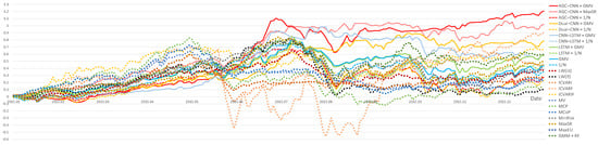 Figure 13 displays the visualization of Cumulative Returns. From Figure 13, it is evident that, as time goes on, the AGC-CNN+GMV two-stage approach proposed in this paper has surpassed all other models. Regardless of the stock selection model used, optimizing the portfolio with the GMV model consistently outperforms the 1/N model. While other traditional models may initially perform better, their effectiveness tends to diminish over time, and they exhibit greater volatility. Additionally, the performance of AGC-CNN + MaxSR is excellent. However, since the time consumption of using MaxSR as the second-stage portfolio optimization model is 10 times that of GMV, the GMV model is preferred over MaxSR.