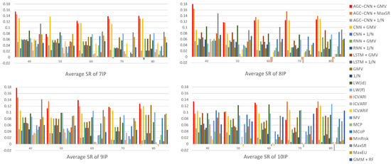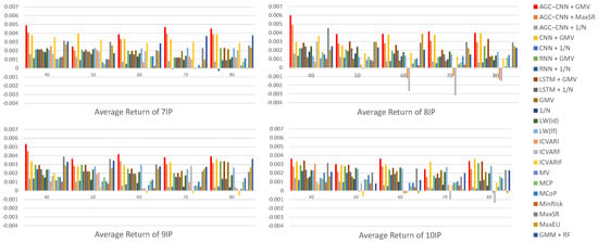 Figure 14 displays the visualization of Average Returns. From the visualization results of Average Return, it is evident that our proposed AGC-CNN+GMV two-stage approach performs the best regardless of the number of stocks selected or any other dimension considered. The performance of stock pre-selection is significantly superior to scenarios without stock pre-selection. Traditional portfolio optimization models may exhibit a better performance during certain specific periods; however, overall, their effectiveness still pales in comparison to the two-stage model we propose. Specifically, while these traditional models can yield considerable returns in individual cases, they lack the sustainability and stability of the two-stage model.