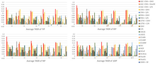 Figure 16 displays the visualization of Average TASR. The visualization results indicate that, even when considering turnover, the AGC-CNN+GMV two-stage approach proposed in this paper also exhibits excellent performance. Moreover, it can be observed that under certain conditions, the traditional portfolio optimization models can also exhibit an exceptional performance.