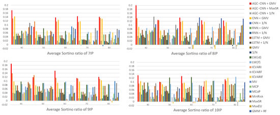 Figure 17 displays the visualization of the Average Sortino Ratio. The Sortino Ratio is a specialized measure used to evaluate investment return risks, specifically designed to focus more on downside risk—the potential loss associated with an investment—rather than overall volatility. The visualization results indicate that, when considering downside risk, the AGC-CNN+GMV two-stage approach proposed in this paper also exhibits excellent performance. Furthermore, while the traditional portfolio optimization models LW(id) and LW(lf) demonstrate commendable results during certain periods, their performance still falls short of that of the AGC-CNN+GMV model. This suggests that, although traditional models may achieve satisfactory results under specific conditions, our proposed two-stage model clearly has greater advantages in terms of overall performance and downside risk management.