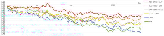 Figure 18 presents the visualization of Cumulative Returns from 2020 to 2023. It is evident that all models show an overall downward trend, indicating the considerable effect of the COVID-19 pandemic and the Russia–Ukraine conflict on the stock market. However, our AGC-CNN+GMV model demonstrates the most gradual decline, even showing an upward trend in 2020, highlighting the effectiveness and robustness of the model.