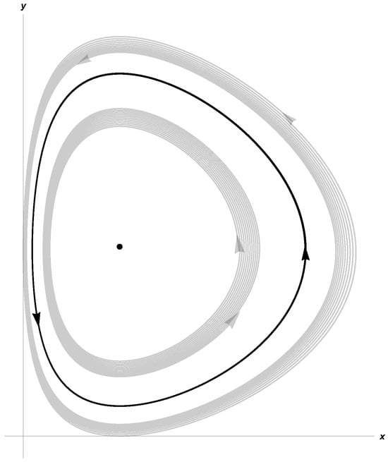 Its eigenvalues are and . Since , if , then we have an unstable node in (0, 0) and a saddle when . Finally, if , the equilibrium point is not hyperbolic and is a saddle node (see Sotomayor’s theorem [31]).