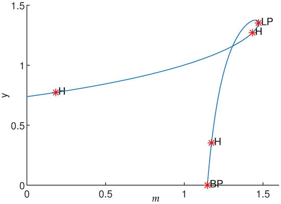 Numerical simulations show that apart from the Hopf bifurcation, the system presents other bifurcations. By varying parameter m using MatCont software, one saddle-node bifurcation (LP) and branch point (BP) are also observed (see Figure 6). Furthermore, bifurcations of codimension 2 were found in the negatives; thus, they are not of interest.