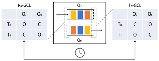 Thus, it is evident that the end-to-end delay range of a frame is determined by the slot length and the number of hops, independent of the network topology. The node model that supports CQF is shown in Figure 1, where and are responsible for receiving and forwarding TT flows from each port. In a slot, one queue is in receive mode, while the other is in send mode, and the mode of each queue flips between adjacent slots to avoid additional computation and configuration overhead.