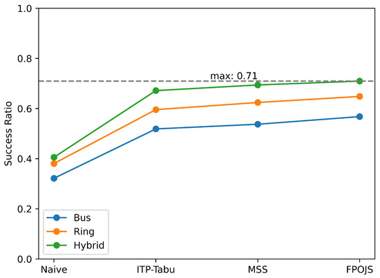 To comprehensively evaluate the performance of our algorithm, it is compared with the naive algorithm, greedy algorithm, Tabu-ITP algorithm, and MSS algorithm across three metrics: scheduling success ratio, execution time, and resource utilization. Figure 4 and Figure 5 show the scheduling success ratios of each algorithm under bus, ring, and hybrid network topologies without considering path constraints, under the conditions of 500 and 800 flows, respectively. The FPOJS algorithm achieves higher scheduling success ratios compared to other algorithms in different topologies and scheduling scales.