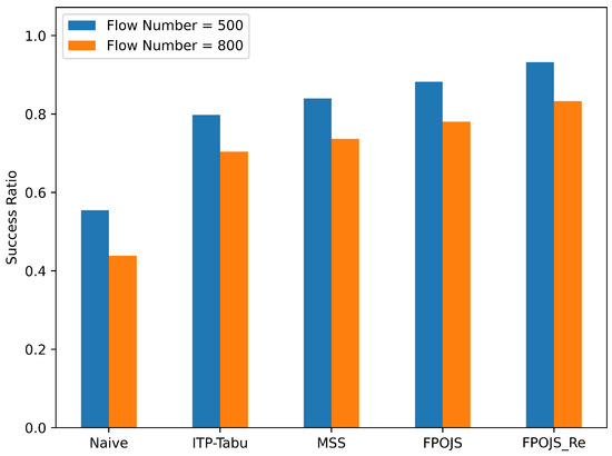 The slot length is related to several factors, including flow period, deadline, link speed, node cache queue length, and network scale. An increase in the node cache queue length can increase the lower bound of the slot length to some extent. Bello et al. [6] and Steiner et al. [7] indicate that an increase in slot length allows nodes to accommodate more packets, thereby increasing the number of flows that can be scheduled. However, the constraint that packets cached from the previous time slot must be entirely transmitted in the next time slot increases the single-hop delay. When single-hop delays accumulate on the path, the total end-to-end delay of the flow increases, resulting in a flow that cannot be scheduled. Additionally, due to the limitations of node hardware resources, the increase in time slot length requires higher memory requirements on the nodes, which in turn increases the complexity and cost of node implementation. More importantly, the precision of gated control is inversely proportional to the slot length. In a certain traffic period, the range of injection offsets that can be selected by the source system increases with the decrease in the slot length, which not only improves the control accuracy but also increases the search range. The size of the slot length is limited by the bandwidth of the link, and if the time reserved is much longer than the time required to send the queue cache, no data will be transferred to the remaining slots. Figure 10 compares the scheduling success rates among various algorithms for queue lengths of 6000, 8000, 12,000, and 15,000. The comparison reveals that as the queue length increases, more flows can be accommodated in a single scheduling instance, thereby reducing the probability of congestion. This leads to an increase in the number of flows that can be successfully scheduled. Specifically, when the queue length reaches 15,000, the scheduling success ratio of Algorithm FPOJS_RE approaches 100%. This observation underscores the importance of queue length in optimizing scheduling performance and highlights the efficacy of Algorithm FPOJS_RE in managing large-scale flow scheduling with minimal congestion.