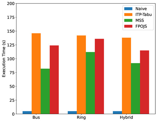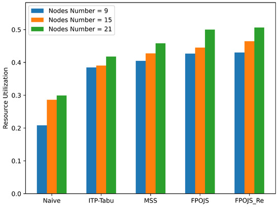 In the aforementioned experiments, path selection was not incorporated into the scheduling process. The purpose is to demonstrate the success ratio improvement created by the modifications to the priority calculation in the FPOJS algorithm. Across 100 experimental runs, the FPOJS algorithm achieved an average scheduling success ratio that was 1.4% higher than the MSS algorithm and 4% higher than the Tabu-ITP algorithm, with both computation speed and resource utilization surpassing MSS. In subsequent experiments, to demonstrate the validity of incorporating path selection, tests will be conducted in the more complex hybrid topology illustrated in Figure 3. In the hybrid topology, we first test the FPOJS algorithm without using the port resource optimization function. The results are shown in Figure 6. After adding path options, the number of available flows increased by 26%, indicating greater flexibility in scheduling. The scheduling results show that the scheduling success ratio of the FPOJS algorithm is 4% higher than that of MSS without changing the total amount of resources. In large-scale hybrid network scenarios, the FPOJS algorithm has a higher scheduling success ratio. Figure 7 presents a comparison of the scheduling success ratios under varying numbers of nodes. The aforementioned experiments prove that the FPOJS algorithm can be effectively applied to both simple and complex scenarios. Notably, the improvement in scheduling success rate brought about by the FPOJS algorithm is more significant in complex topologies than in simple ones.The overflow of queue resources caused by traffic accumulation is one of the important reasons for the scheduling success rate. Improving the load balancing level can alleviate this phenomenon. Resource utilization can reflect the load balancing level to a certain extent and is positively correlated with the scheduling success rate on the whole. As shown in Figure 8, based on the resource utilization rate of each algorithm with different numbers of nodes in the complex topology, the FPOJS algorithm has better load balancing levels in the complex topology environment. However, due to the inclusion of path selection and an additional step for port resource optimization, it does not exhibit a superior performance in overall computational speed, with an average computation duration of approximately 20% longer than that of the MSS algorithm. Although this has increased the execution time to a certain extent, it is accompanied by significant improvements in scheduling success rate and resource utilization. The comparison of execution time is presented in Figure 9.