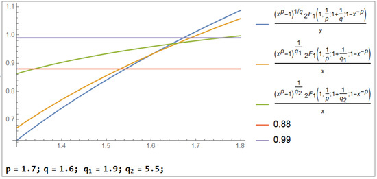 We omit similar verification of the monotonicity of the functions and with the signs of derivatives obvious from the resulting expressions. Numerical tests show that the functions , , , , are not monotonic. For example, Figure 1 shows that is not a monotone function for and y near 1, as we see that when , but when . This can be made rigorous by computation with guaranteed precision at fixed values of the argument and the second parameter. For another example, the derivative