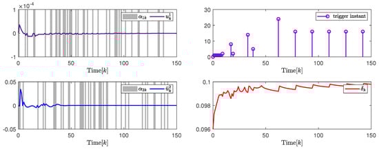 The state responses of and are shown in Figure 8. The change trajectory in the control signals and are demonstrated on the left in Figure 9. The release instants, the release intervals, and the adaptive law are shown on the right in Figure 9.