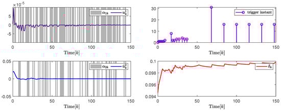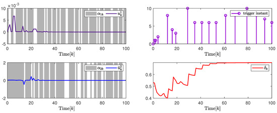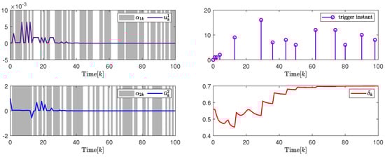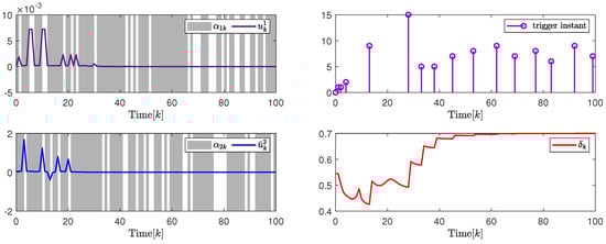 Considering the influence of deception attacks, attack probability is introduced to design the random adaptive law . It is obvious that the expression is always greater than 0. When the attack intensity increases, that is, the attack probability becomes larger, then the term makes the adaptive law smaller, the triggered condition is easier to meet, so that more sampling data are transmitted to compensate for the impact of the deception attacks. On the other hand, when the communication channel data are transmitted normally, the will degrade into ; thus, will relatively increase. Such changes can make the triggered condition more stringent, help to further reduce the triggered data, and improve resource utilization. The detailed operation process can be understood by Algorithm 2.