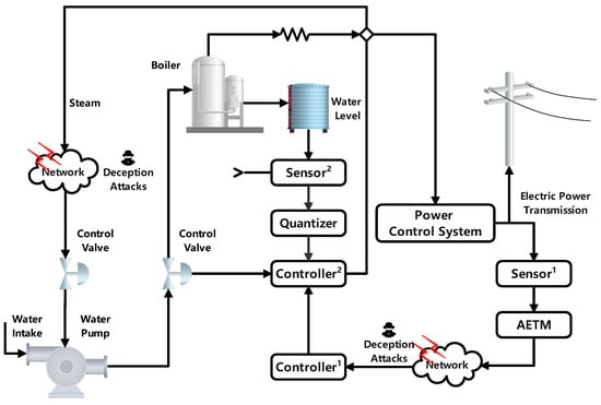 In this article, we focus on the study of random deception attacks in which the attacker knows the system state information in advance, such as [], considering the influence of primary loop random deception attacks and actuator saturation, and the control problem of NCCSs based on hybrid drive mechanism was studied. However, most of the existing literature only focuses on the threat of deception attacks on a single channel, and the research on deception attacks on any multi-channel is not sufficient [,], especially the security control problem of NCCSs under the threat of multi-channel deception attacks. Malicious adversaries that launch deception attacks on any multi-channel will seriously damage the integrity of the data transmitted by the main loop and the secondary loop of the NCCSs, thus affecting the adjustment of the entire NCCSs and affecting the performance and stability of the NCCSs. Therefore, the security cascade control strategy under the threat of arbitrary multi-channel deception attacks deserves further study.