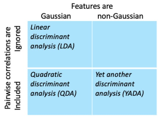 Suppose we have followed the steps outlined in Section 3.1, resulting in -trained YADA models, one for each class label. We distinguish YADA models for different classes by using a superscript to denote the class label for all relevant model properties. For example, will denote the sample covariance obtained in training step 4 and represents the joint PDF defined by Equation (7), both for the YADA model for class i. Let denote a feature vector with an unknown label. In this section, we present ways to use the collection of YADA models to predict the label for .
