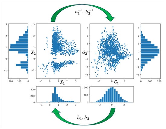 The connection between the feature space and the space of multivariate Gaussian random variables is an important property of the YADA model, and one that is exploited in the following sections for classification, synthetic data, and other applications. To further illustrate this connection, consider Figure 3, which illustrates two features and mapped to two correlated Gaussian variables and ; the marginal histograms are also shown. The data can be mapped back and forth from the two spaces using Equation (3) and its inverse. These data came from the phoneme dataset [30].