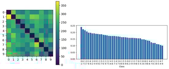 Once trained, comparing the YADA models can provide useful information about how well separated the training data are among the different classes. This measure can provide a baseline for trustworthiness; if the classes are close together and hence difficult to separate, we should perhaps be skeptical of any predictions by ML models trained on these data. To illustrate, we consider the Modified National Institute of Standards and Technology (MNIST) dataset of images of handwritten digits 0, 1, …, 9 [34]. The dataset contains 60,000 images for training and 10,000 images for testing, and they are approximately evenly distributed over the 10 classes. Each image contains 28 × 28 grayscale pixels which, when scaled, can be interpreted as continuous features that take values in the interval . We trained a YADA model for each class, and then, as described in Section 2.2.6, computed the K-L divergence amongst the 10 models. The results are illustrated in Figure 5. The left panel illustrates the K-L divergence between the 10 models as a matrix colored by the value of the divergence, with values ranging from 0 along the diagonal to a maximum of approximately 350; the divergence is greatest for the YADA models of class 0 and class 1. The right panel illustrates a “class separation score”, which is simply a symmetric version of the K-L divergence, i.e., , with each being normalized by the entropy of the reference distribution (see Equation (12)). The class separation scores take values between zero and one and are illustrated as a bar plot, sorted in decreasing order. The greatest separation is between classes 0 and 1; the least separation is between classes 7 and 9.