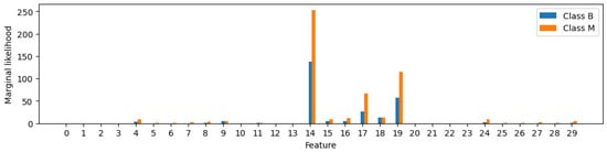 where is the prior probability that an unlabeled test point belongs to class i, and defined by Equation (7) can be interpreted as the joint likelihood that comes from class i. Typically, the prior probabilities are assumed to be the relative frequency of each class in the training dataset; non-informative priors, where each class is assumed equally likely, can also be used. To address any numerical issues, for calculations, we instead compute the log of Equation (16), i.e.,
