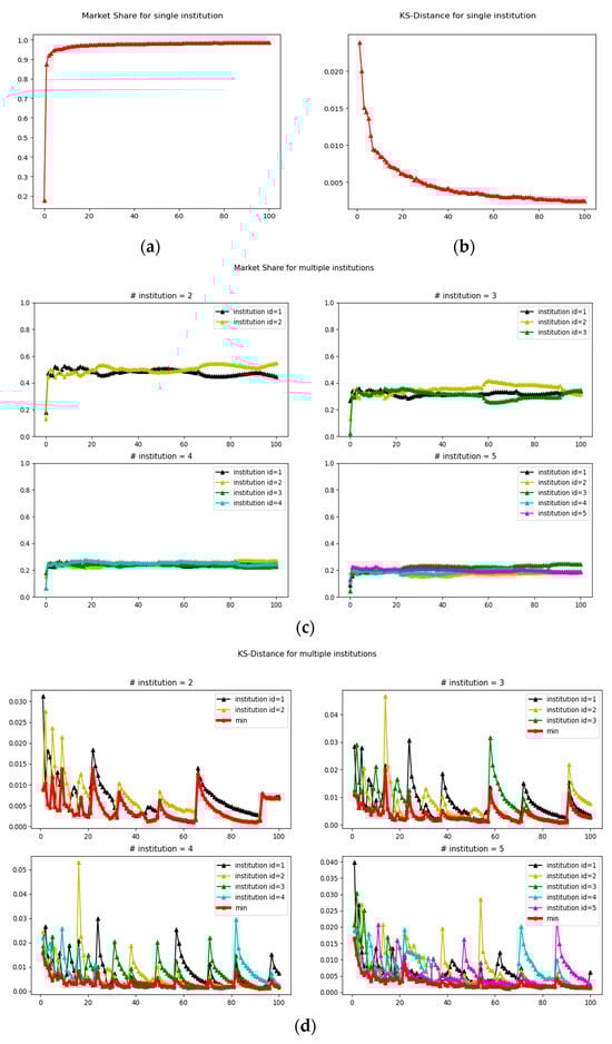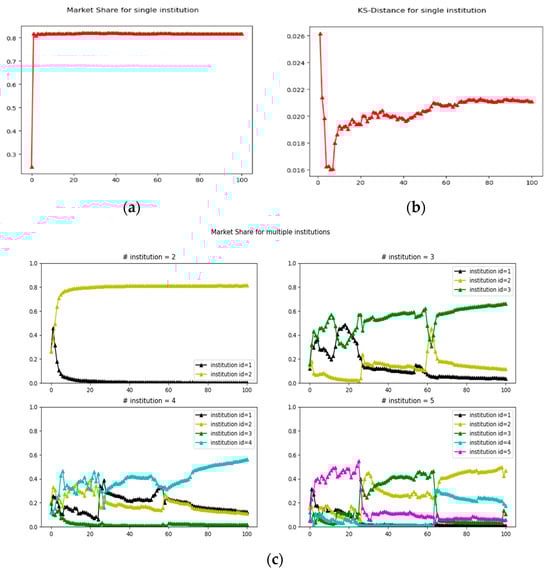 Figure 2d,e, it is clear that institutions whose equilibrium market share shows a trend of convergence to zero have more violent data representativeness fluctuations, while the head institution, with its position as the head, maintains a constant level that is significantly greater than zero and fluctuates less. Compared to the institutional data trajectory in