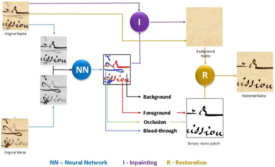 The overall workflow of the process of recto–verso manuscript enhancement is illustrated in Figure 1. In this diagram, the focus is on the recto side only.