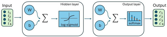 We adopted a simple feedforward network with the architecture of a multilayer shallow neural network with one hidden layer and ten neurons and backpropagation training [15] (see Figure 2). To be specific, we used the function patternnet, available since the r2010b version of the Matlab Deep learning Toolbox. We run it on the 2023a version of Matlab. This network is a pattern recognition NN that can be trained to classify inputs according to target classes.