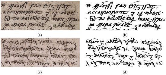 Figure 3a,c show the recto and the reflected verso of the ninth pair with the real degradation that affected the two images. Figure 3b,d show the manually built binary ground truths provided in the dataset. These ground truths represent the correct foreground texts on the two manuscript sides according to the perception of the human operator that constructed them.