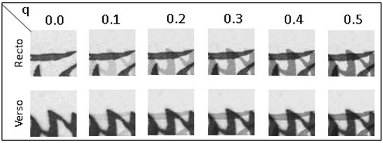 As highlighted several times, we could have used the widest range of possible interference levels, say , to build maximally general NNs. However, it is obvious that a network focused on effective degradation is more efficient. We therefore roughly estimated the maximum value for q for the entire dataset. In practice, we manually sampled a number of bleed-through pixels in the image for which we thought the interference was strong, then inverted Equation (1) for q based on the corresponding density values on the two sides, and finally averaged the obtained values.