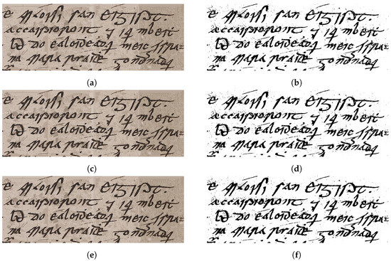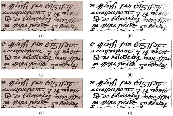 Virtual restoration of the synthetic pair shown in Figure 7c,d: (a) recto restored with 3 classes and 2 features; (b) corresponding binarization; (c) recto restored with 4 classes and 2 features; (d) corresponding binarization; (e) recto restored with 4 classes and 4 features; (f) corresponding binarization.
