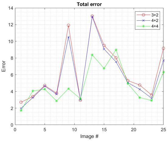 Plots of the total errors for all 25 pairs using the three different network architectures. The errors on the recto and verso sides of each pair have been averaged.