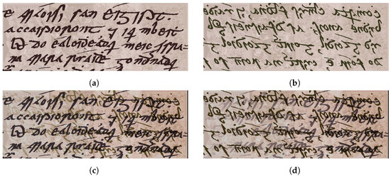 Still based on the ninth pair of images, we built an artificial clean recto–verso pair by placing the clean foreground text onto a textured background obtained by inpainting. The foreground text was obtained by selecting the RGB values for the real degraded images in Figure 3a,c at the positions of the black pixels in the corresponding binary ground truth maps (Figure 3b,d). Figure 7a,b show this clean, ideal manuscript pair. An artificially degraded pair was then obtained by mixing the ideal pair using the data model in Equation (1), where the percentage of penetrating ink was increased from to from left to right (Figure 7c,d).