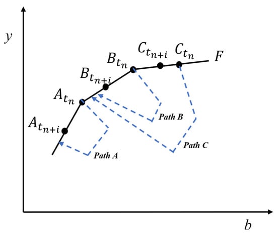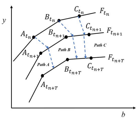 Figure 2 gives the intuitive explanation of model (6). As shown in the figure, there are three DMUs (i.e., A, B, and C) undertaking carbon reduction over the future T periods. In each period, the decision-making units A, B, and C form a production frontier F, with the frontier differing across periods. Model (6) allows each DMU to reallocate its total CO2 emissions, given by regulators, across different periods to optimize its cumulative output over the designated timeframe. Thus, model (6) calculates the carbon reduction amounts for each DMU across different future periods and generates a reduction path for each unit. As illustrated, the reduction path for DMU A over the future periods is labeled as Path A (see dashed lines and arrows). Similarly, the reduction path for DMU B is labeled as Path B, and for DMU C as Path C.