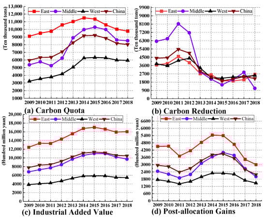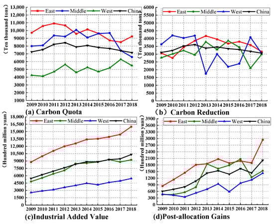 The trend of changes in intertemporal and interregional allocation results of industrial carbon emissions and post-allocation gains (2009–2018).