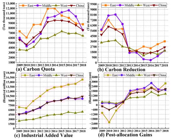As shown in Figure 6c, after the cross-temporal allocation of carbon quotas, the industrial value-added of the three regions and the national average increased annually. The eastern region had the highest industrial value-added and the fastest growth rate. The western region had the lowest industrial value-added and the slowest growth rate. The central region’s industrial value-added was close to the national average, with a growth rate higher than that of the western region. Over time, the differences in industrial value-added between the three regions increased.