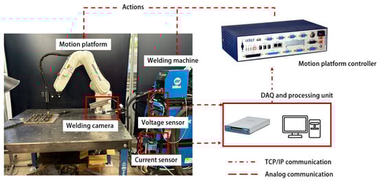 Experimental setup employed in this study. The robot controller communicates with the acquisition system using a TCP/IP protocol, whereas the welding machine interfaces through analog wired connections.