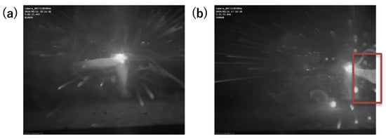 The images captured by the welding camera were utilized to assign labels in every 1 s length window, such as (a) defect-free deposition and (b) a layer that collapsed at the beginning. The red box highlight the layer collapse captured by welding camera.