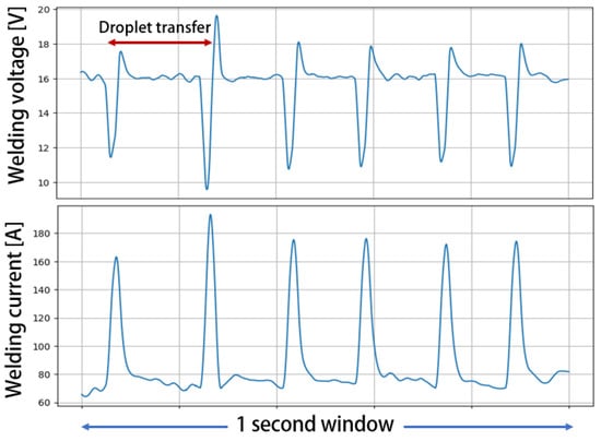 The dataset used in this work was generated by printing 14 wall structures, each consisting of 10 layers, with all parameters kept constant during the deposition to ensure stability. The welding current and voltage were recorded at 5 kHz using a NI 6361 acquisition board and employed different process parameters for each wall, as outlined in Table 2. The gas flow rate and the contact to workpiece distance (CTWD) were fixed to 18 L/min and 15 mm, respectively. Additionally, a welding camera (Xiris XCV-1000) was employed to capture images of the process, which were subsequently used to label the collected data (see Figure 3). In fact, due to parameter selection, several defects occurred along the deposited layer, such as layer collapse or porosity. Aiming to develop a real-time anomaly detection module, data were processed by extracting 1 s windows from each deposited layer, as illustrated in Figure 4, and a label of anomaly is assigned if a defect occurred during the 1 s deposition using the video recorded with the welding camera.