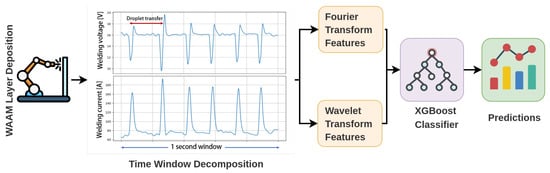 Currently, the number of research studies related to the application of ML in monitoring, optimization, and control of WAAM is exponentially increasing [14,15,16]. In particular, aiming to monitor the process and allow for the early identification of anomalies, several researchers proposed different techniques to develop online anomaly detection applications, employing different data sources and algorithms [17,18,19]. However, all the proposed methodologies are based on black-box approaches, since they rely on extracting statistical features from both time and frequency domain content of the time series data or automatic features from images [20,21,22,23], and they use these features as input to the ML algorithms. One issue with this approach, suggested by Norrish in [24], is that the WAAM systems might be treated as black-box machine tools, neglecting established welding quality control practices, further complicating the root cause identification and subsequent decision making. On the other hand, the high performance of these approaches should encourage researchers to explore methods that allow them to highlight how different features contribute to specific outcomes, such as defect generation. Understanding these contributions can offer valuable insights for decision-making modules, enabling them to take more informed actions [25,26,27]. Moreover, insights into how and why AI models make certain decisions are essential for enhancing their reliability, trustworthiness, and overall effectiveness in real-world applications. This recent growing demand for explainable AI models has led to increased interest in boosting models [28], primarily because of their ability to analyze feature importance and consequently improve the interpretability of results. Recent advancements have leveraged these models to identify and rank the importance of various features, helping researchers and practitioners understand how different factors contribute to the predictions of the models [29,30]. Despite the potential benefits of these methods for improving root cause identification, there is a noticeable absence of research in the literature on analyzing anomalies in additively manufactured parts.