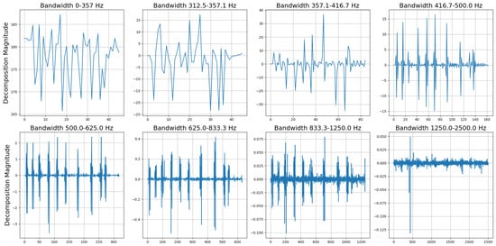 In welding tasks, selecting the appropriate number of decomposition levels is a complex decision that depends on the frequency response of the signal. For example, in this work, the short-circuit nature of the deposition means that most of the frequency response is concentrated within a lower frequency bandwidth. To effectively separate these frequencies, several decomposition levels are required due to the high sampling rate used. In the context of this work, with the sample frequency of 5 kHz, the value of Nyquist frequency is . A 7-level decomposition was performed using a Daubechies wavelet of 4 order. This decomposition resulted in levels similar to those illustrated in Figure 7. From these decompositions, 40 features were extracted for each sensor. Combined with the 5 features obtained from the FFT analysis, a total of 45 features for sensor were derived for a total of 90 features for sample. These features describe each second of deposition and its frequency content, which can subsequently be classified using various machine learning algorithms.