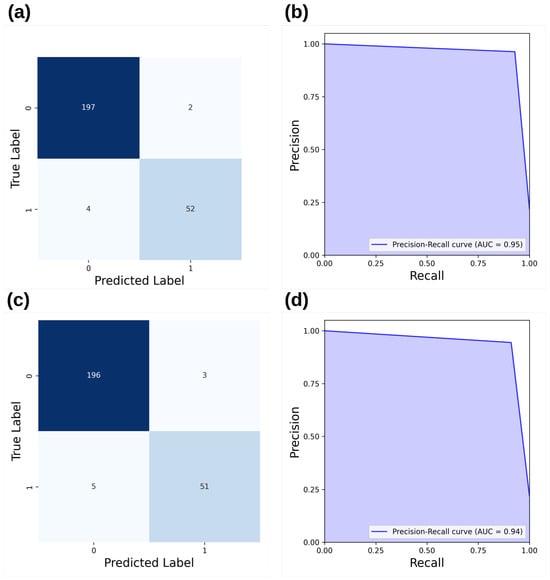 (a) Confusion matrix for LightGBM, (b) precision–recall area under the curve (PR-AUC) for LightGBM, (c) confusion matrix for XGBoost, and (d) precision–recall area under the curve (PR-AUC) for XGBoost.
