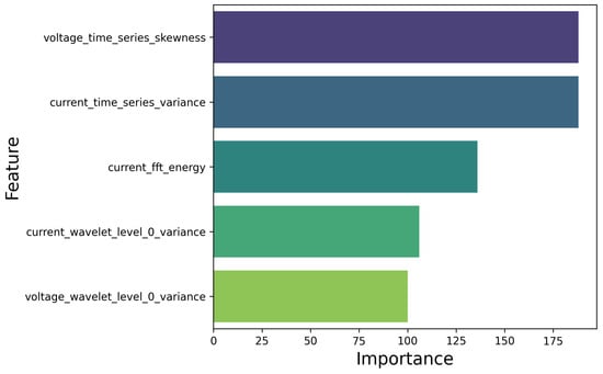 Explainability is crucial for understanding how machine learning models make predictions. Beyond enhancing trust in the models, explainability also provides insights into the underlying complexities of the processes being modeled. This understanding can reveal additional information beyond the classification labels, offering a deeper comprehension of the phenomena involved. In the proposed boosting models, explainability is achieved through feature importance metrics, which evaluate each feature’s impact on model performance by measuring its contribution to reducing impurity. Additionally, SHAP values could be used to offer more granular insights, providing detailed, instance-level explanations of feature contributions. The results of features importance of the best model, namely LightGBM, are shown in Figure 9 for the most relevant features, selected with a importance score greater then 100. The analysis reveals that the LightGBM importance scores identify several key features: the skewness of the voltage time series, the variance of the current time series, the energy of the FFT spectrum for current, and the variance of the response of both welding current and welding voltage within the 0–357 Hz bandwidth.