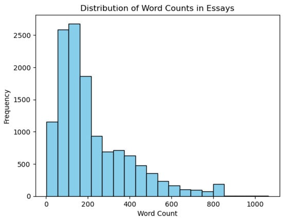 Furthermore, Figure 2 provides a visual representation of the distribution of essay word count, highlighting the diversity in the lengths of the essays. An essay might include as few as two or as many as 1204 words.