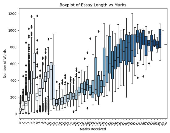Furthermore, it was discovered that the average number of distinct words in an essay is 119.02, indicating the vocabulary richness throughout the dataset. Descriptive statistics are used to investigate the connection between an essay’s word count and its grade. With a median word count of 184, the mean word count is 252.48. The word count’s standard deviation is 203.36, which suggests that essay length varies. A correlation coefficient 0.60 indicates a moderate positive correlation between word count and marks received. A boxplot showing the correlation between essay length and grades is shown in Figure 3.
