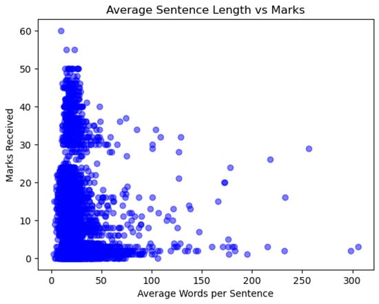 Additionally, the analysis examines whether getting higher marks for an essay correlates with having a good vocabulary. Vocabulary Richness (TTR) descriptive data show that TTR is 0.53 on average, with a standard deviation of 0.13 and a mean of 0.53. Descriptive data for the marks obtained also show a mean of 6.80, a median of 3, and an 8.97 standard deviation. An understanding of the connection between marks and sentence structure can be gained from looking at Figure 4, which shows the relationship between sentence length and essay score. The results indicate that shorter sentences tend to receive lower marks, while essays with longer, more complex sentences are more likely to achieve high scores. This highlights the model’s sensitivity to sentence complexity as a significant feature in essay evaluation.