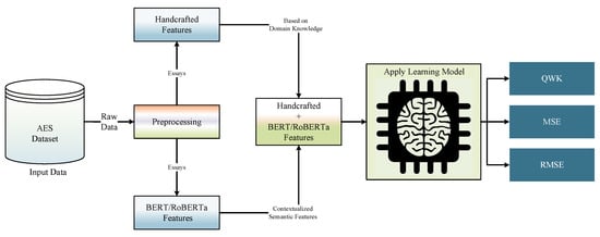 A key component of AES is feature extraction, which extracts pertinent linguistic and contextual data from the essays to guide the system in calculating scores. With the proposed approach, a thorough portrayal of the writings is obtained using a blend of handcrafted and BERT features. Handcrafted features are essential to AES because they offer insightful information about many linguistic and structural aspects of the essays. These characteristics improve the overall functionality and interpretability of the scoring system by supplementing the data gathered by neural network models such as RoBERTa.