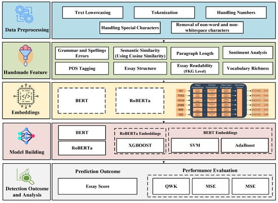 The goal of [] was to create an application for assessing digital English essays using the XGBoost classifier. The system has 12 scoring elements, and uses the datasets of junior high school students’ argumentative and narrative essays. Through a 5-fold cross-validation evaluation, the automated essay grader achieves an average accuracy of 66.87%. The Timed Aggregate Perceptron vector model, proposed by [,], assesses writings using a combination of factors. This model was trained using word character count, misspelled words, and the n-gram representation. The essay’s ranking was used to assess its grade. Furthermore, ref. [] described a text-mining technique for evaluating short answers. They measured sentence distances to compare the model’s and the student’s replies.